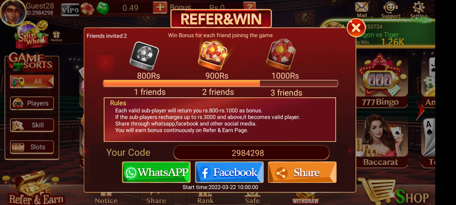 The game offers a welcome bonus, daily login rewards, referral bonuses, and special promotions.